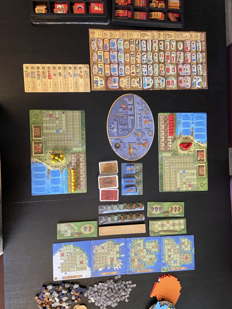 Each player board has a section which must be filled with various produce and loot like a slow-moving Tetris puzzle. As you accumulate various pieces, your income goes up and you cover more and more of the empty spaces which otherwise cause victory point loss. The risk in discovering new lands is that you get lots of points but also get an extra space you have to fill up with even more resources. I’m still unsure whether it was a good idea for me to explore or of it was a liability.
