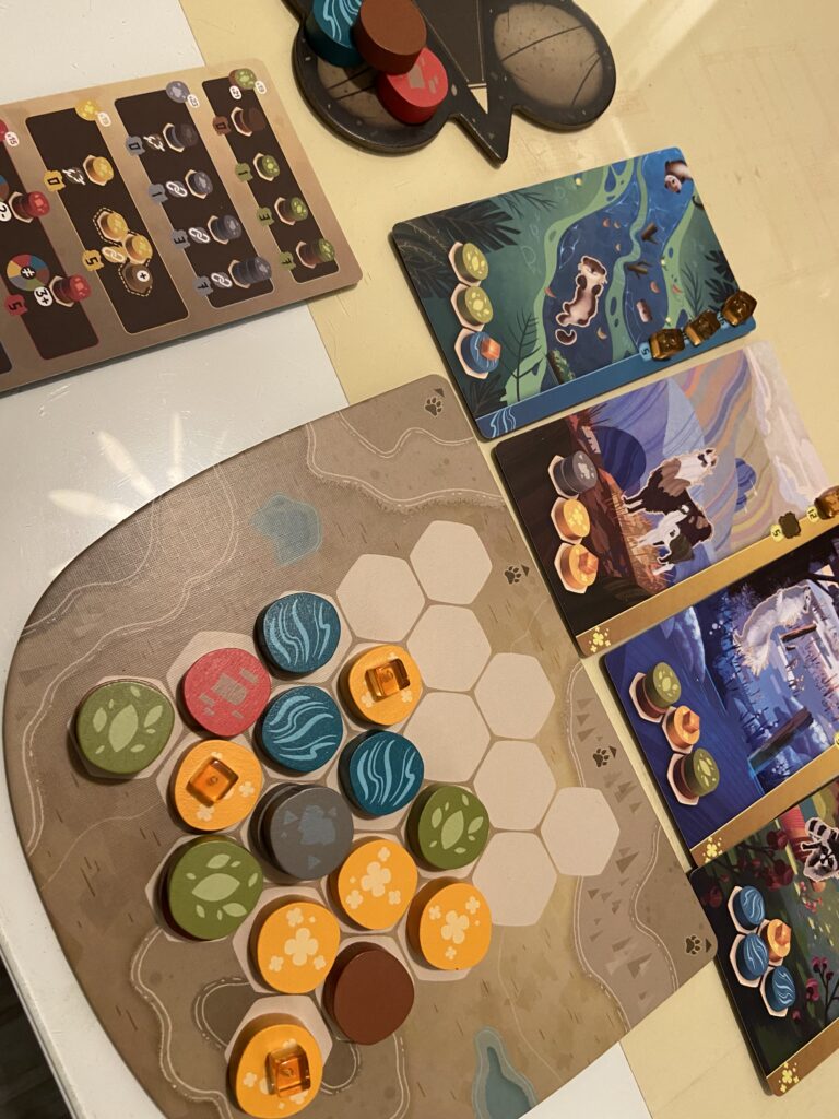 Based on the title, I assumed Harmonies had something to do with music but in fact it’s a game about building different types of animals harmonious habitats. It’s a pretty abstract game, somewhat resembling Azul, except this time you try to fill the enclosure on your player board with terrain types that work together to house as many animal cubes as possible.