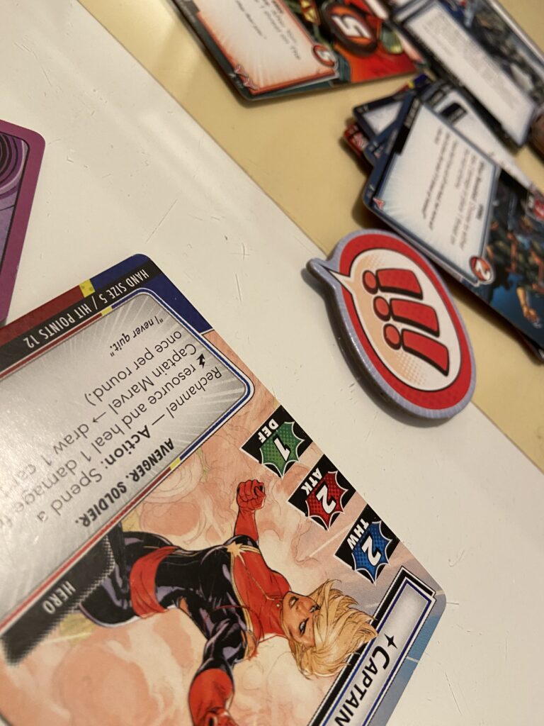 During the villain phase, tokens are added to the scheme, the villain attacks the heroes and the players have to draw encounter cards in which something bad always happens. One of the fun complications of the game is that each hero has a secret identity. They can flip between the alias and their hero persona, and if they’re in their secret identity when the villain starts their turn, they won’t get attacked. Instead, the villain furthers the scheme. I played Captain Marvel and flipping between the civilian and hero identities was crucial for healing the character and keeping them in the action.