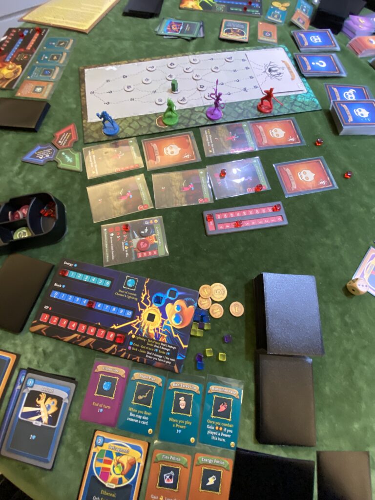 It took us 11 hours to play through all the four acts and win the last battle. Despite this epic duration, the game stayed quite engaging and interesting. Although in a sense this is a dungeon crawler, in practice the design doesn’t have a lot of resemblance to the dungeon crawl boardgame genre. The card-based battles feel more like collective puzzles you solve together with the other players, performing actions concurrently, sometimes strategizing together to make sure events occur in the optimal order.