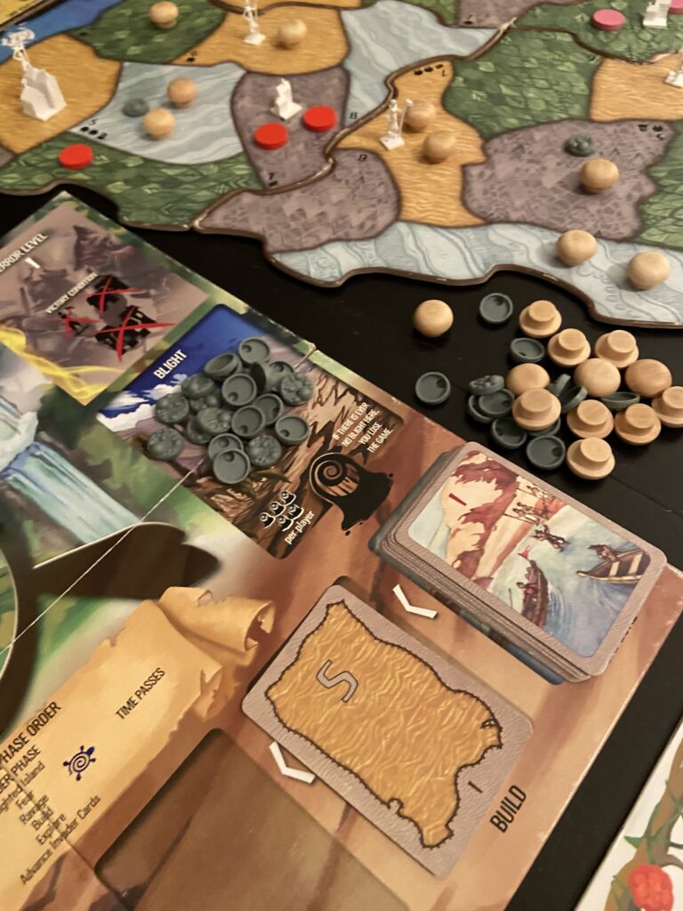 Playing as nature spirits seeking to repel colonizers was fun. It was easy to get caught up in the mechanics, cursing how there seemed to be more of them every turn and rejoicing as their cities and towns fell to various disasters. In terms of both emotional and intellectual content, the game felt a step above most boardgames I’ve played. There was something to reflect in the experience after it was over.