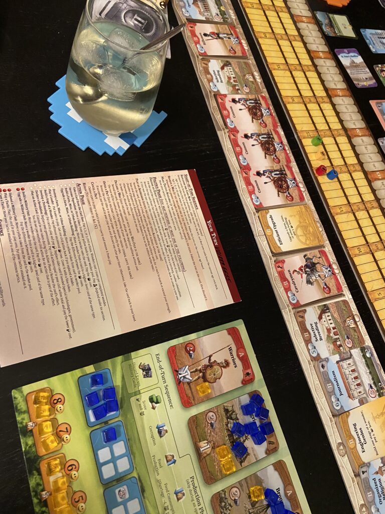 There’s no central board. Instead, each player has their own mini-boards for their civilizations, and there are a few separate extra boards and tracks to follow everyone’s progress. The game is about resource allocation, making sure that your fields and mines produce enough that you can keep on building structures, wonders and military units.